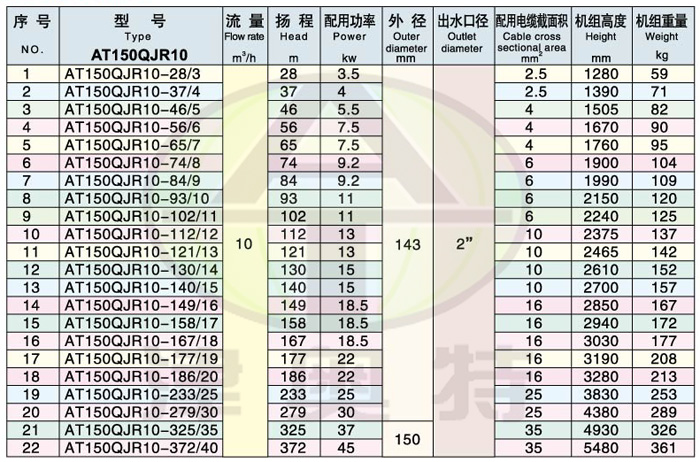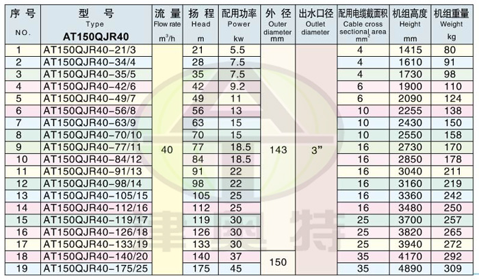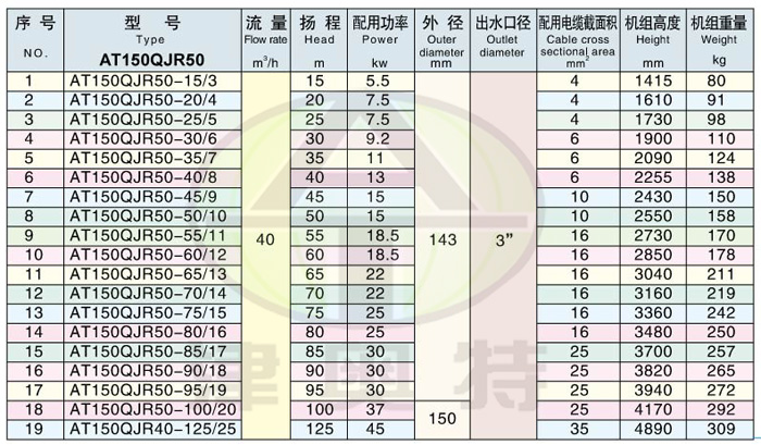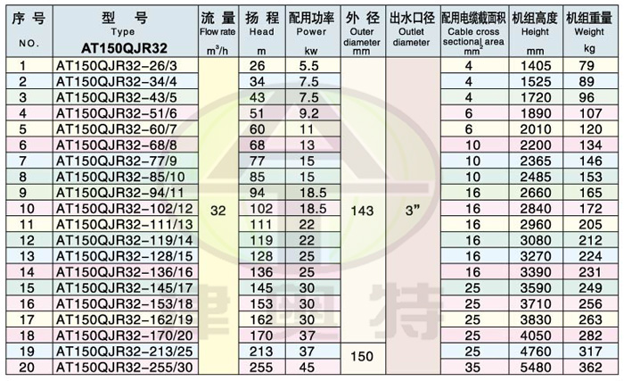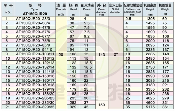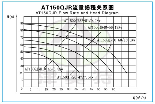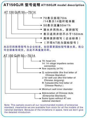 例如:150QJR50-70/14 200表示適用井徑不小于150毫米。 Q 表示潛水的(漢語(yǔ)拼音的打頭字母);J 表示井用(漢語(yǔ)拼音的打頭字母)。 R 表示熱水(漢語(yǔ)拼音的打頭字母) 50表示流量是50m3/h ; 70表示揚(yáng)程是70米; /14表示14級(jí)葉輪串聯(lián)。