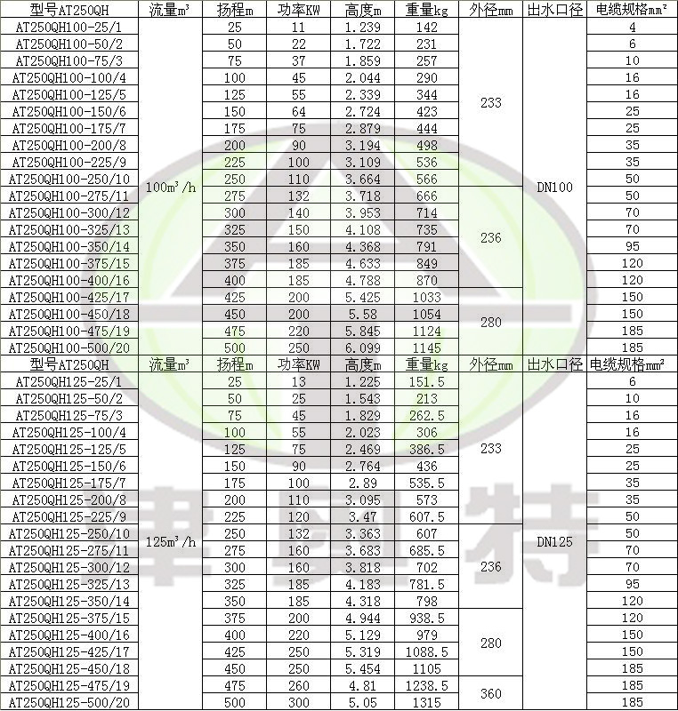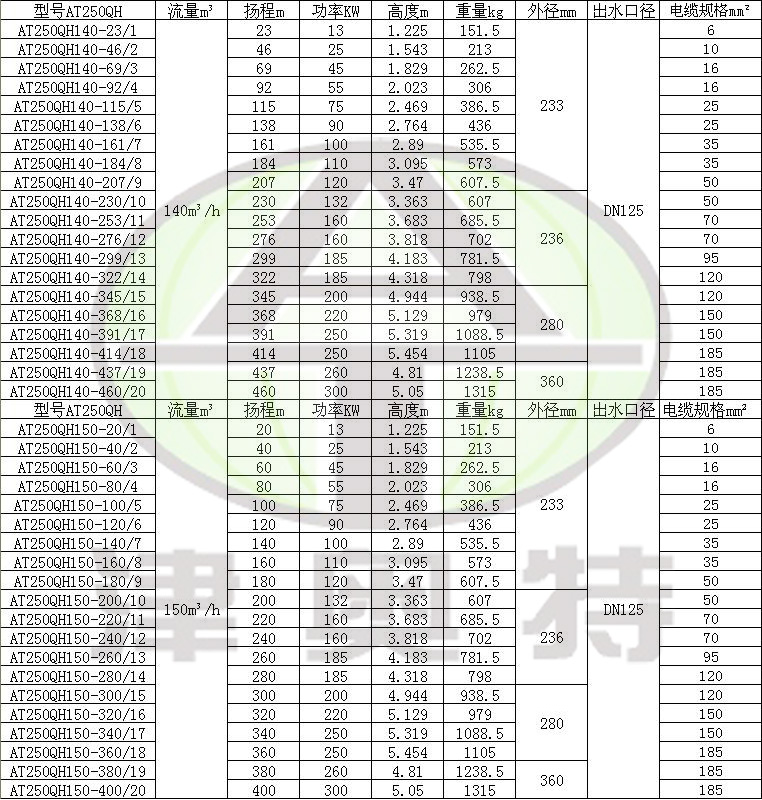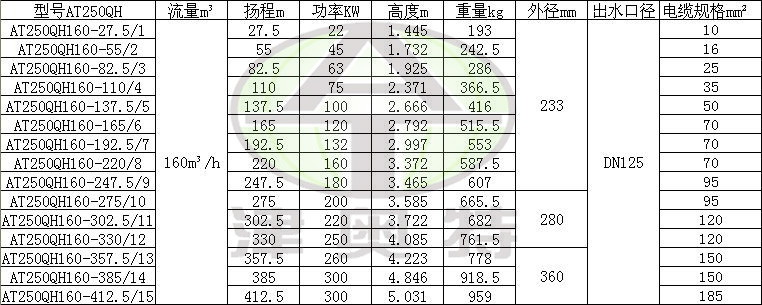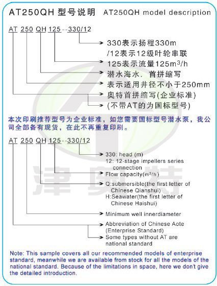 例如:250QH160-330/12 250表示適用井徑不小于250毫米。 Q表示潛水的(漢語拼音的打頭字母); H表示海水(漢語拼音的打頭字母); 160表示流量是160m3/h ; 330表示揚程是330米; /12表示12級葉輪串聯(lián)。