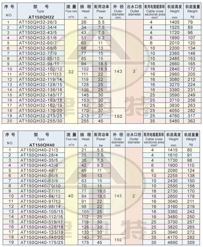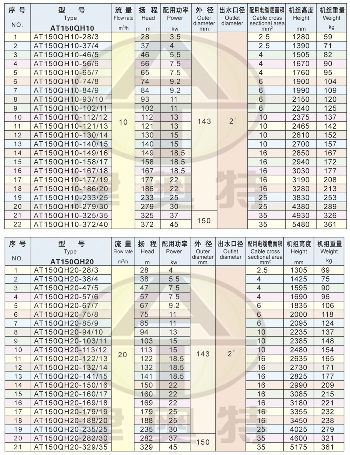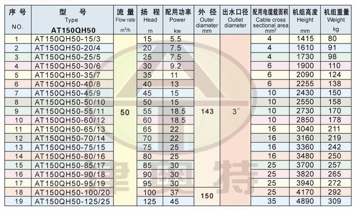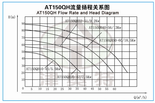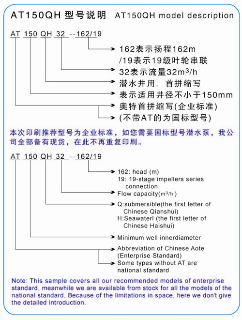 例如:150QH32-162/19 150表示適用井徑不小于150毫米。 Q表示潛水的(漢語拼音的打頭字母); H表示海水(漢語拼音的打頭字母); 32表示流量是32m3/h ; 162表示揚程是162米; /19表示19級葉輪串聯(lián)。